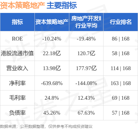资本策略地产港股市值22.18亿港元,在房地产开发Ⅱ行业中排名第58。主要指标见下表: