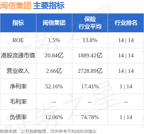 闽信集团港股市值20.84亿港元,在保险行业中排名第14。主要指标见下表: