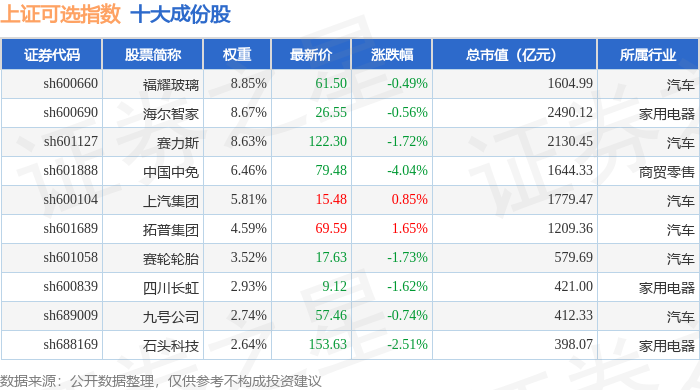 证券之星消息,12月11日,上证可选(000035)指数报收于2925.38点,跌0.94%,成交322.5亿元,换手率2.49%。当日该指数成份股中,上涨的有8家,永辉超市以6.12%的涨幅领涨,下跌的有42家,莱克电气以5.53%的跌幅领跌。
