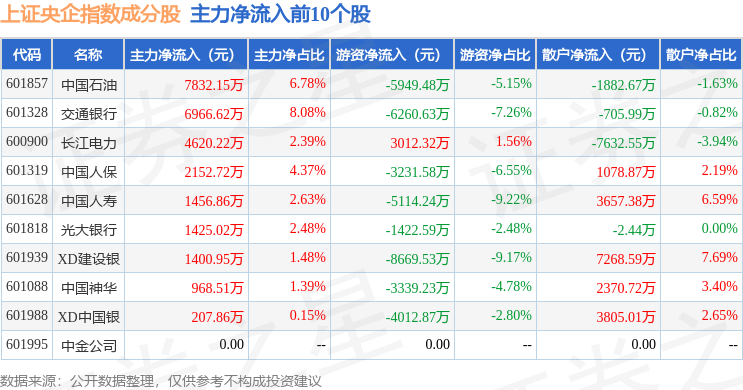 资金流向方面,上证央企(000042)指数成份股当日主力资金净流出合计39.14亿元,游资资金净流入合计7.04亿元,散户资金净流入合计32.09亿元。成份股资金流向详情见下表: