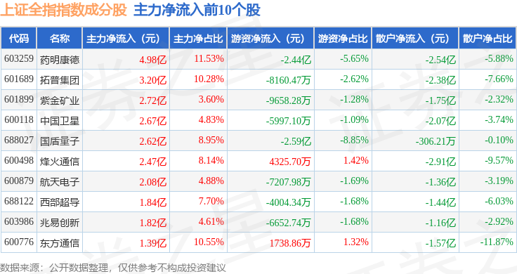 资金流向方面,上证全指(000047)指数成份股当日主力资金净流出合计217.39亿元,游资资金净流入合计65.02亿元,散户资金净流入合计152.37亿元。成份股资金流向详情见下表: