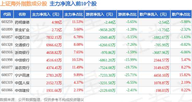 资金流向方面,上证海外(000054)指数成份股当日主力资金净流出合计34.74亿元,游资资金净流入合计3.68亿元,散户资金净流入合计31.05亿元。成份股资金流向详情见下表: