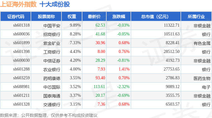 证券之星消息,12月11日,上证海外(000054)指数报收于1561.42点,跌0.26%,成交722.44亿元,换手率0.27%。当日该指数成份股中,上涨的有21家,东方电气以3.06%的涨幅领涨,下跌的有42家,中国中免以4.04%的跌幅领跌。