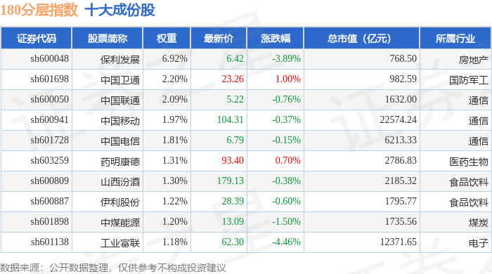 证券之星消息,12月11日,180分层(000093)指数报收于11882.0点,跌0.91%,成交2129.02亿元,换手率0.39%。当日该指数成份股中,上涨的有48家,东方电气以3.06%的涨幅领涨,下跌的有125家,工业富联以4.46%的跌幅领跌。