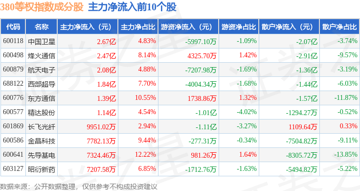 资金流向方面,380等权(000115)指数成份股当日主力资金净流出合计52.08亿元,游资资金净流入合计20.44亿元,散户资金净流入合计31.63亿元。成份股资金流向详情见下表: