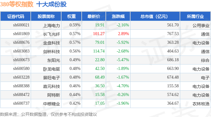证券之星消息,12月11日,380等权(000115)指数报收于8323.23点,跌0.97%,成交1414.46亿元,换手率1.35%。当日该指数成份股中,上涨的有76家,精达股份以6.09%的涨幅领涨,下跌的有302家,厦门国贸以6.35%的跌幅领跌。