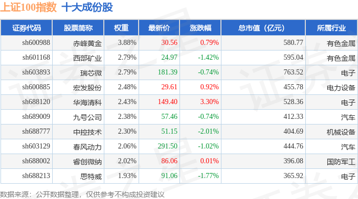证券之星消息,12月11日,上证100(000132)指数报收于5827.89点,跌0.83%,成交318.4亿元,换手率1.24%。当日该指数成份股中,上涨的有22家,华海清科以3.3%的涨幅领涨,下跌的有78家,金盘科技以5.92%的跌幅领跌。