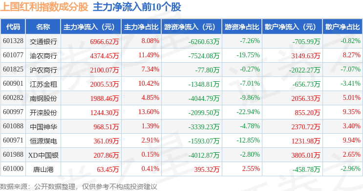 资金流向方面,上国红利(000151)指数成份股当日主力资金净流出合计4.77亿元,游资资金净流出合计1.6亿元,散户资金净流入合计6.38亿元。成份股资金流向详情见下表: