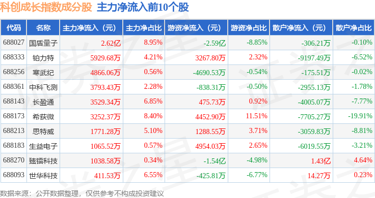 资金流向方面,科创成长(000690)指数成份股当日主力资金净流出合计5.12亿元,游资资金净流入合计4.32亿元,散户资金净流入合计7945.91万元。成份股资金流向详情见下表: