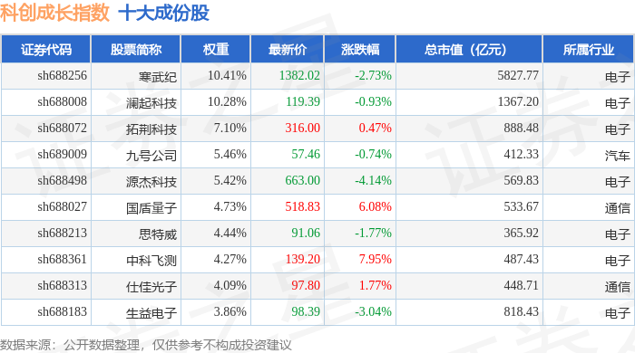 科创成长(000690)指数十大成份股详情如下: