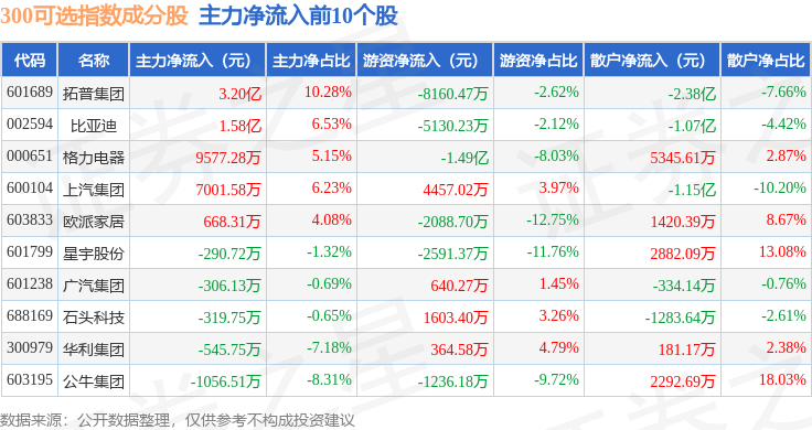 资金流向方面,300可选(000911)指数成份股当日主力资金净流出合计20.01亿元,游资资金净流入合计3.64亿元,散户资金净流入合计16.37亿元。成份股资金流向详情见下表: