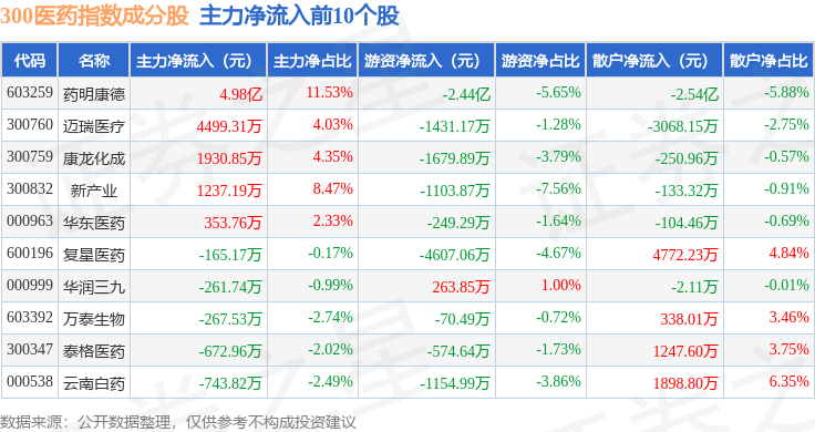 资金流向方面,300医药(000913)指数成份股当日主力资金净流出合计3655.33万元,游资资金净流出合计2.98亿元,散户资金净流入合计3.35亿元。成份股资金流向详情见下表:
