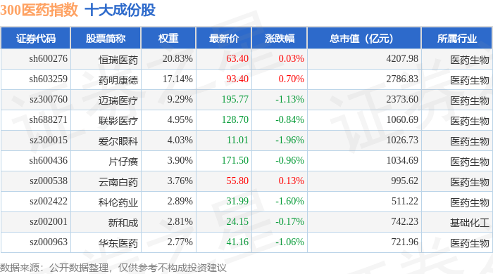 300医药(000913)指数十大成份股详情如下: