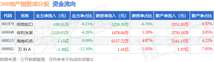 资金流向方面,300地产(000952)指数成份股当日主力资金净流出合计5.06亿元,游资资金净流入合计1.85亿元,散户资金净流入合计3.21亿元。成份股资金流向详情见下表: