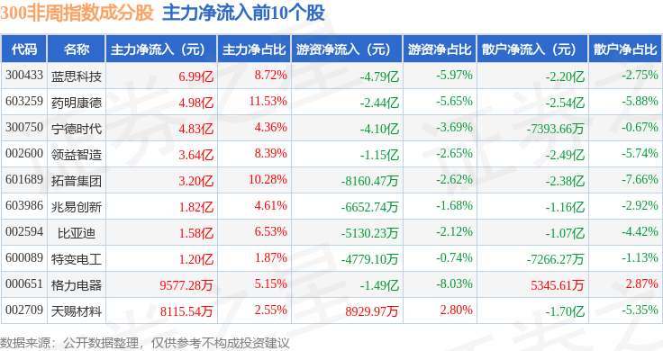 资金流向方面,300非周(000969)指数成份股当日主力资金净流出合计244.43亿元,游资资金净流入合计80.6亿元,散户资金净流入合计163.84亿元。成份股资金流向详情见下表: