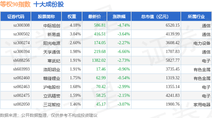 证券之星消息,12月11日,等权90(000971)指数报收于3322.57点,跌1.58%,成交2669.6亿元,换手率0.39%。当日该指数成份股中,上涨的有23家,光启技术以3.62%的涨幅领涨,下跌的有67家,中兴通讯以10.0%的跌幅领跌。