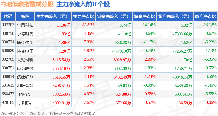 资金流向方面,内地低碳(000977)指数成份股当日主力资金净流出合计4.28亿元,游资资金净流出合计2.83亿元,散户资金净流入合计7.65亿元。成份股资金流向详情见下表: