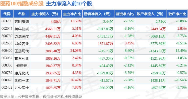 资金流向方面,医药100(000978)指数成份股当日主力资金净流出合计7.71亿元,游资资金净流出合计1.56亿元,散户资金净流入合计9.27亿元。成份股资金流向详情见下表: