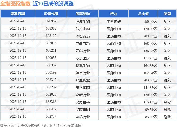 近10日内全指医药(000991)指数成份股做了调整,新纳入了11只股票,剔除了3只股票。