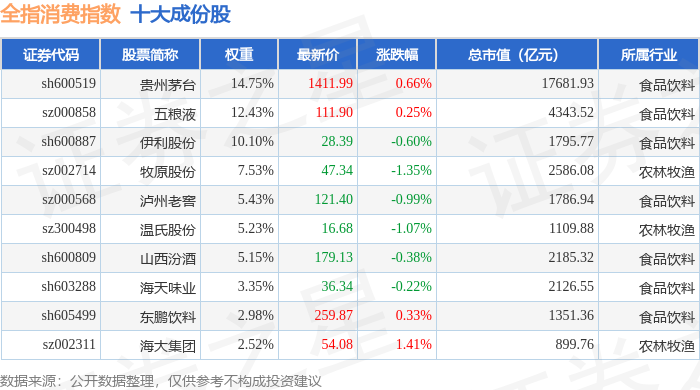 证券之星消息,12月11日,全指消费(000990)指数报收于12812.43点,跌0.49%,成交191.94亿元,换手率0.78%。当日该指数成份股中,上涨的有8家,海大集团以1.41%的涨幅领涨,下跌的有42家,养元饮品以4.99%的跌幅领跌。