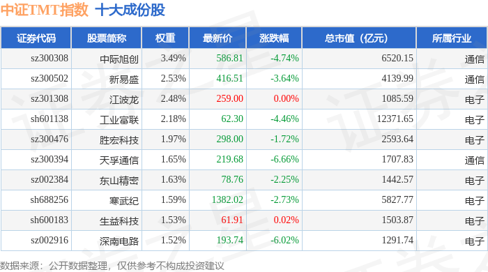 证券之星消息,12月11日,中证TMT(000998)指数报收于2851.58点,跌2.07%,成交2587.35亿元,换手率1.43%。当日该指数成份股中,上涨的有12家,蓝思科技以6.06%的涨幅领涨,下跌的有88家,中兴通讯以10.0%的跌幅领跌。