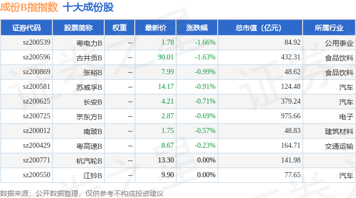 证券之星消息,12月11日,成份B指(399003)指数报收于8325.8点,跌0.84%,成交5746.86万元,换手率0.08%。当日该指数成份股中,下跌的有8家,粤电力B以1.66%的跌幅领跌。