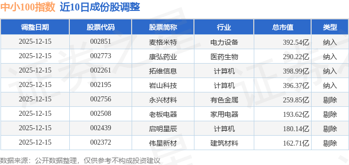 近10日内中小100(399005)指数成份股做了调整,新纳入了4只股票,剔除了4只股票。