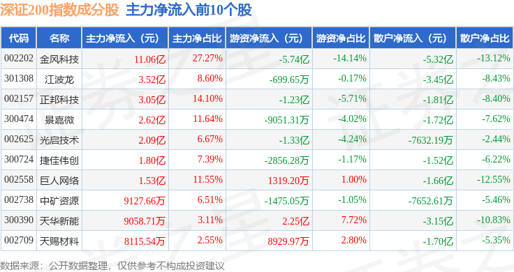 资金流向方面,深证200(399009)指数成份股当日主力资金净流出合计61.95亿元,游资资金净流入合计11.17亿元,散户资金净流入合计50.79亿元。成份股资金流向详情见下表: