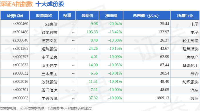 证券之星消息,12月11日,深证A指(399107)指数报收于2570.82点,跌1.41%,成交10927.05亿元,换手率2.95%。当日该指数成份股中,上涨的有368家,通光线缆以19.98%的涨幅领涨,下跌的有2489家,ST惠伦以20.04%的跌幅领跌。