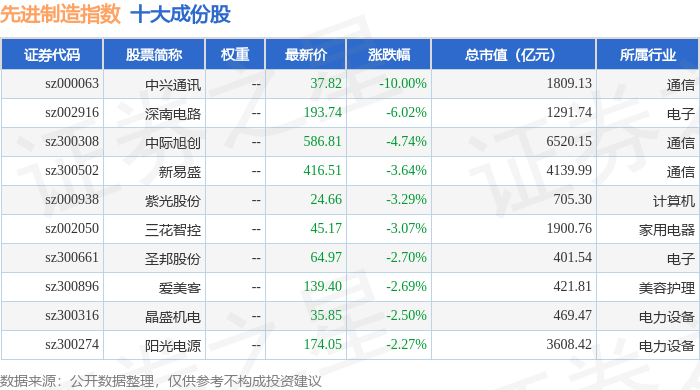 证券之星消息,12月11日,先进制造(399260)指数报收于3774.29点,跌1.66%,成交1608.67亿元,换手率1.44%。当日该指数成份股中,上涨的有9家,蓝思科技以6.06%的涨幅领涨,下跌的有41家,中兴通讯以10.0%的跌幅领跌。