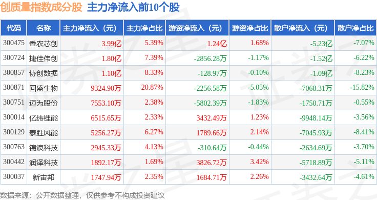 资金流向方面,创质量(399269)指数成份股当日主力资金净流出合计93.21亿元,游资资金净流入合计49.06亿元,散户资金净流入合计44.15亿元。成份股资金流向详情见下表:
