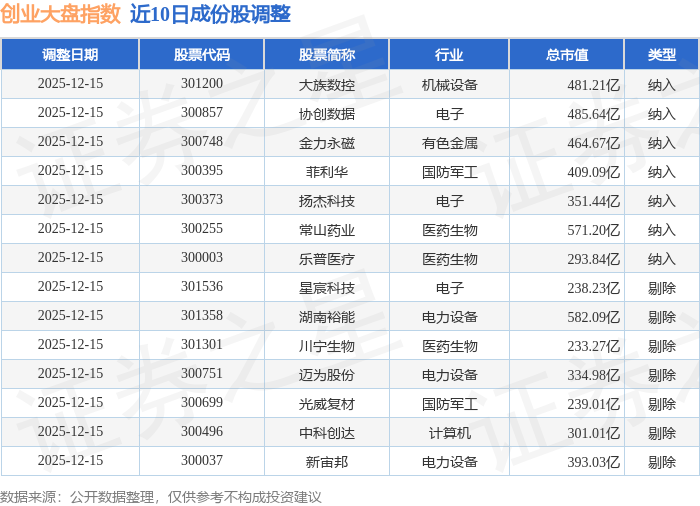 近10日内创业大盘(399293)指数成份股做了调整,新纳入了7只股票,剔除了7只股票。