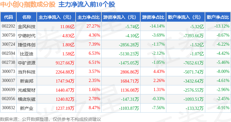 资金流向方面,中小创Q(399294)指数成份股当日主力资金净流出合计15.81亿元,游资资金净流出合计1.93亿元,散户资金净流入合计17.73亿元。成份股资金流向详情见下表: