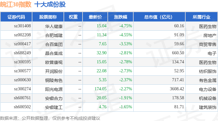 皖江30(399350)指数十大成份股详情如下: