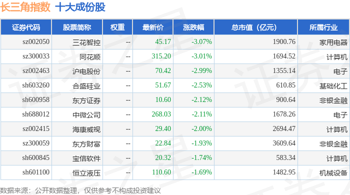 资金流向方面,长三角(399355)指数成份股当日主力资金净流出合计27.63亿元,游资资金净流入合计3.95亿元,散户资金净流入合计23.68亿元。成份股资金流向详情见下表: