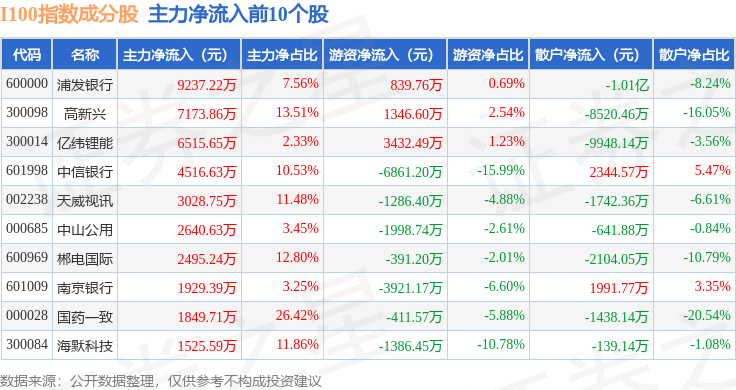 资金流向方面,I100(399415)指数成份股当日主力资金净流出合计30.39亿元,游资资金净流入合计6.97亿元,散户资金净流入合计23.42亿元。成份股资金流向详情见下表: