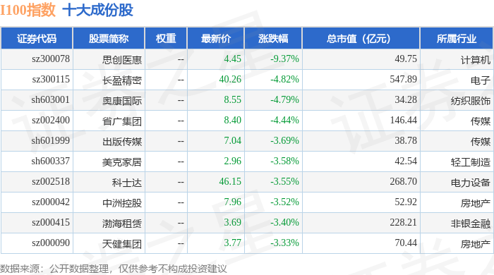 证券之星消息,12月11日,I100(399415)指数报收于6895.32点,跌1.25%,成交935.61亿元,换手率0.45%。当日该指数成份股中,上涨的有12家,中山公用以4.12%的涨幅领涨,下跌的有82家,思创医惠以9.37%的跌幅领跌。