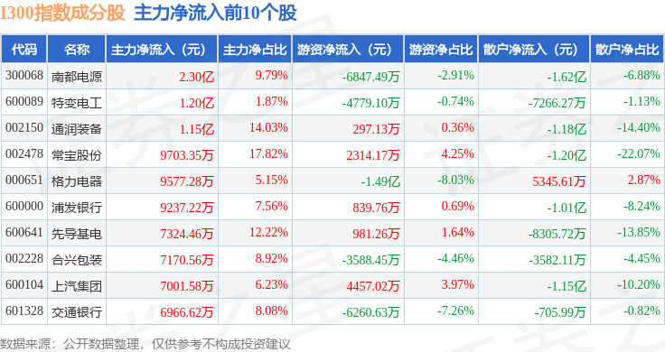 资金流向方面,I300(399416)指数成份股当日主力资金净流出合计97.08亿元,游资资金净流入合计19.01亿元,散户资金净流入合计78.07亿元。成份股资金流向详情见下表: