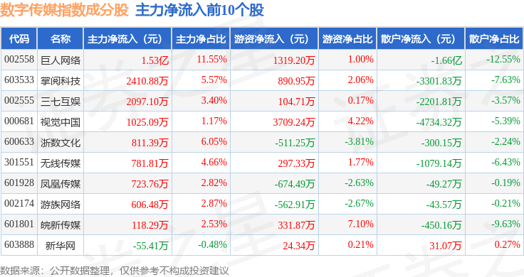 资金流向方面,数字传媒(399434)指数成份股当日主力资金净流出合计29.59亿元,游资资金净流入合计4.6亿元,散户资金净流入合计24.99亿元。成份股资金流向详情见下表: