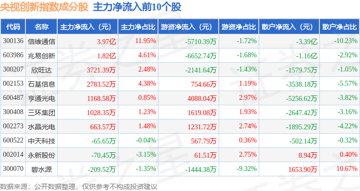 资金流向方面,央视创新(399551)指数成份股当日主力资金净流出合计61.28亿元,游资资金净流入合计17.96亿元,散户资金净流入合计43.32亿元。成份股资金流向详情见下表: