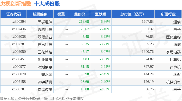 央视创新(399551)指数十大成份股详情如下: