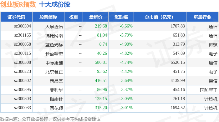 证券之星消息,12月11日,创业板R(399606)指数报收于3507.28点,跌1.41%,成交1929.4亿元,换手率2.34%。当日该指数成份股中,上涨的有13家,迈为股份以12.82%的涨幅领涨,下跌的有87家,天孚通信以6.66%的跌幅领跌。