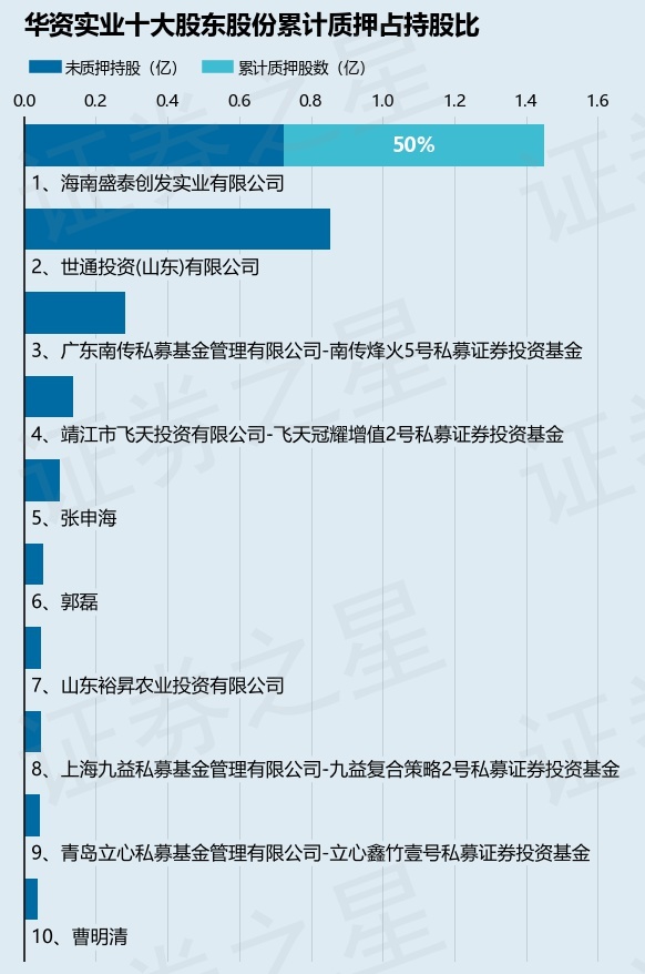 截止本公告日,股东海南盛泰创发实业有限公司已累计质押股份7249.7万股,占其持股总数的50.0%。本次质押后华资实业十大股东的累计质押股份占持股比例(占持股比例的计算以公司最新一期财务报表公布的十大股东的持股总数为基准)见下图: