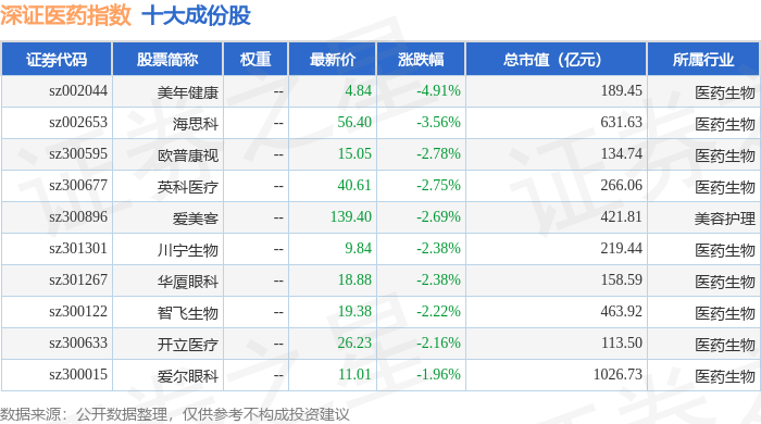 证券之星消息,12月11日,深证医药(399618)指数报收于8100.1点,跌0.93%,成交146.23亿元,换手率1.04%。当日该指数成份股中,上涨的有12家,京新药业以3.63%的涨幅领涨,下跌的有44家,美年健康以4.91%的跌幅领跌。