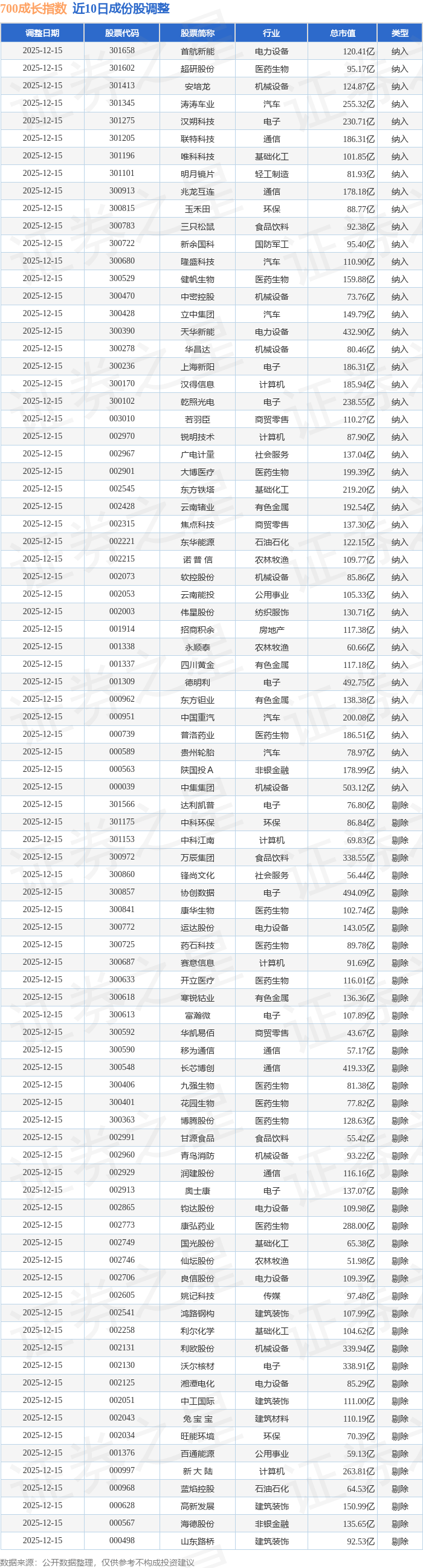 近10日内700成长(399628)指数成份股做了调整,新纳入了43只股票,剔除了43只股票。
