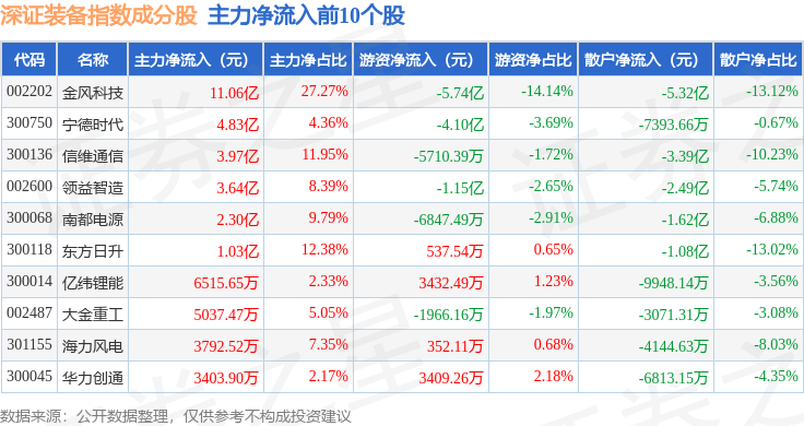 资金流向方面,深证装备(399636)指数成份股当日主力资金净流出合计107.63亿元,游资资金净流入合计41.71亿元,散户资金净流入合计65.92亿元。成份股资金流向详情见下表: