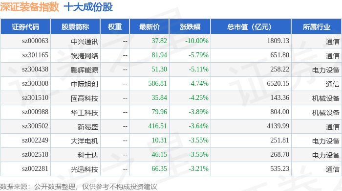 证券之星消息,12月11日,深证装备(399636)指数报收于8065.91点,跌1.39%,成交1763.72亿元,换手率3.14%。当日该指数成份股中,上涨的有20家,金风科技以9.97%的涨幅领涨,下跌的有59家,中兴通讯以10.0%的跌幅领跌。