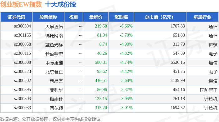 证券之星消息,12月11日,创业板EW(399635)指数报收于2078.16点,跌1.5%,成交1929.4亿元,换手率2.34%。当日该指数成份股中,上涨的有13家,迈为股份以12.82%的涨幅领涨,下跌的有87家,天孚通信以6.66%的跌幅领跌。
