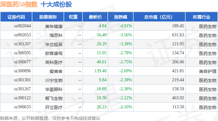 证券之星消息,12月11日,深医药50(399647)指数报收于7964.82点,跌1.0%,成交137.68亿元,换手率1.05%。当日该指数成份股中,上涨的有10家,常山药业以1.99%的涨幅领涨,下跌的有40家,美年健康以4.91%的跌幅领跌。