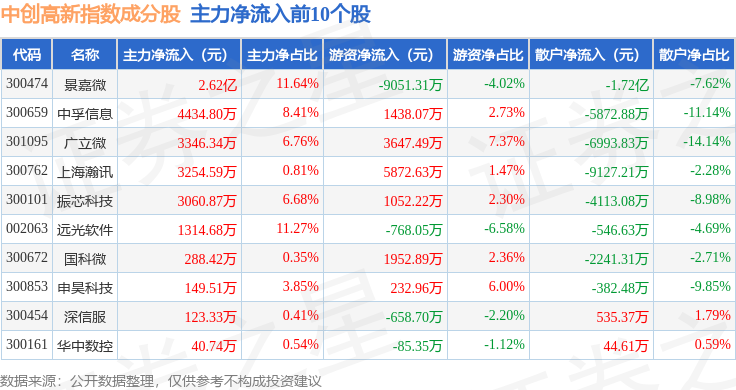 资金流向方面,中创高新(399652)指数成份股当日主力资金净流出合计19.19亿元,游资资金净流入合计5.84亿元,散户资金净流入合计13.34亿元。成份股资金流向详情见下表: